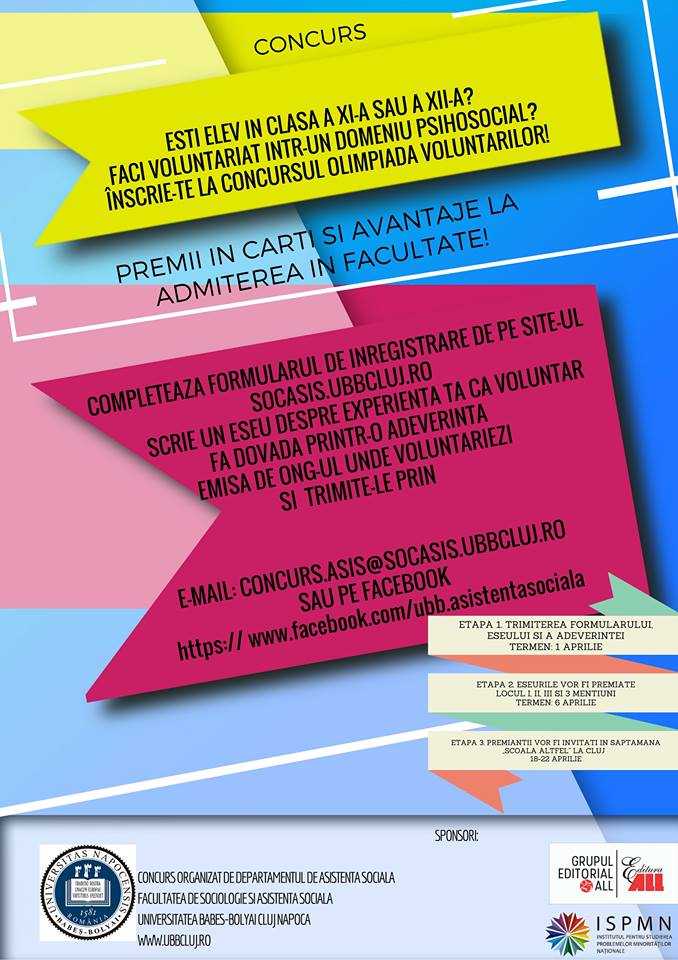 Departamentul de Asistență socială din cadrul Universitatii Babeș-Bolyai Cluj-Napoca ofera locuri bugetate fără admitere elevilor implicați în activitati de voluntariat din domeniul psihosocial. Concursul de eseuri Olimpiada Voluntarilor se adresează elevilor din clasa a XI-a și a XII-a.