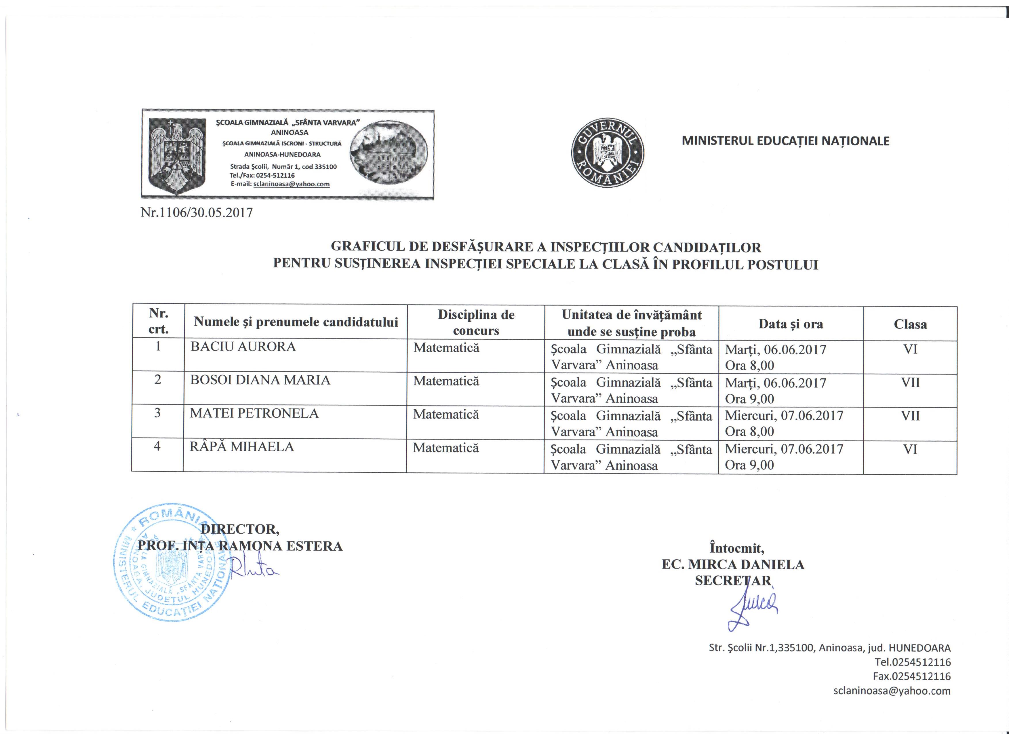 Datorită faptului că în săptămâna 29.05.2017-02.06.2017 la Şcoala Gimnazială „Sfânta Varvara” Aninoasa se desfăşoară programul naţional "Şcoala altfel", susţinerea inspecţiilor speciale la clasă s-a reprogramat conform graficului din ataşament.