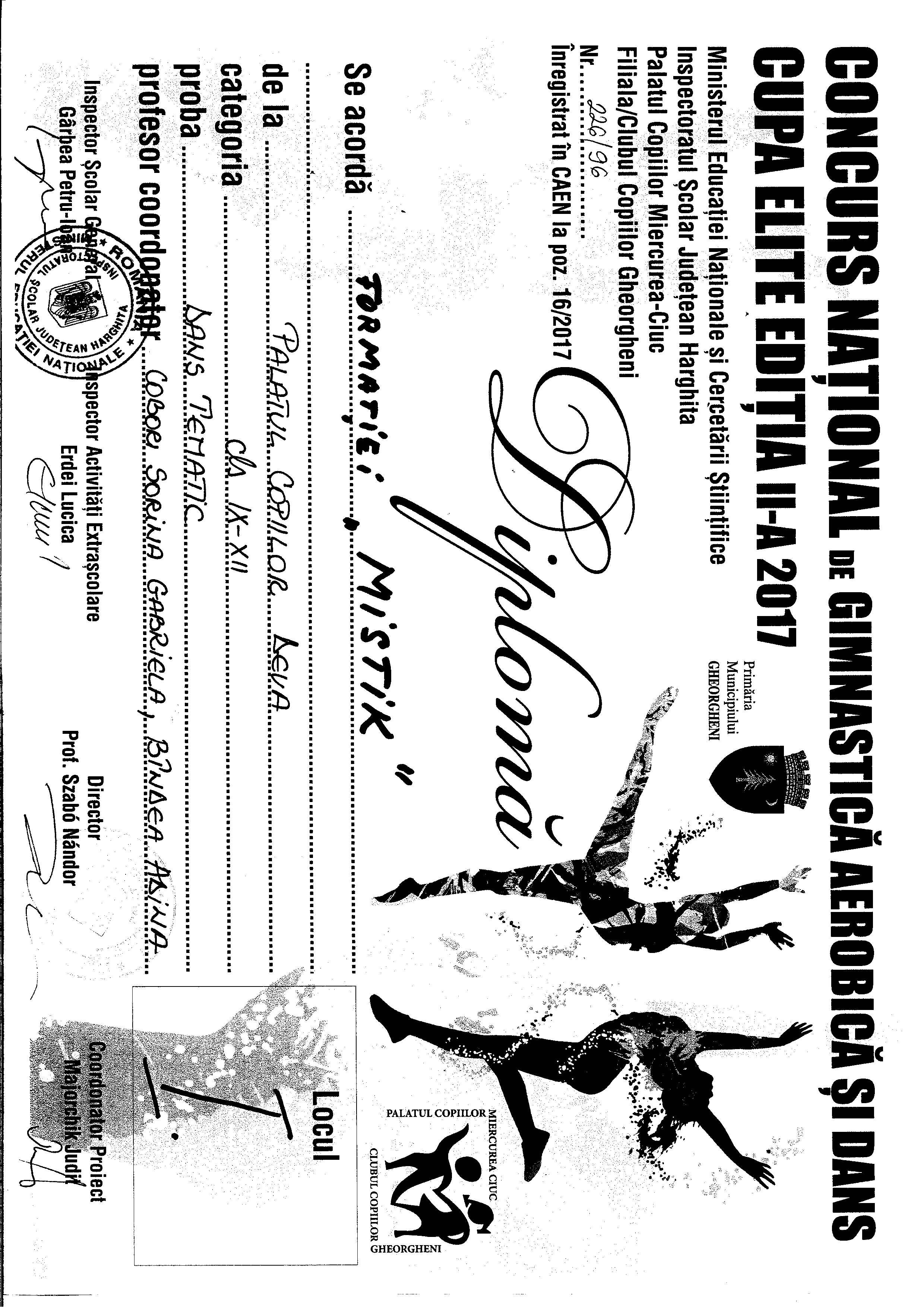 În perioada 27 - 28 octombrie 2017 s-a desfăşurat la Gheorghieni Concursul Naţional de gimnastică aerobică şi dans modern“ Cupa Elite ", organizat de Palatul Copiilor Miercurea- Ciuc . Rezultatele obţinute de formaţia de Dans Modern de la Palatul Copiilor Deva au fost următoarele :