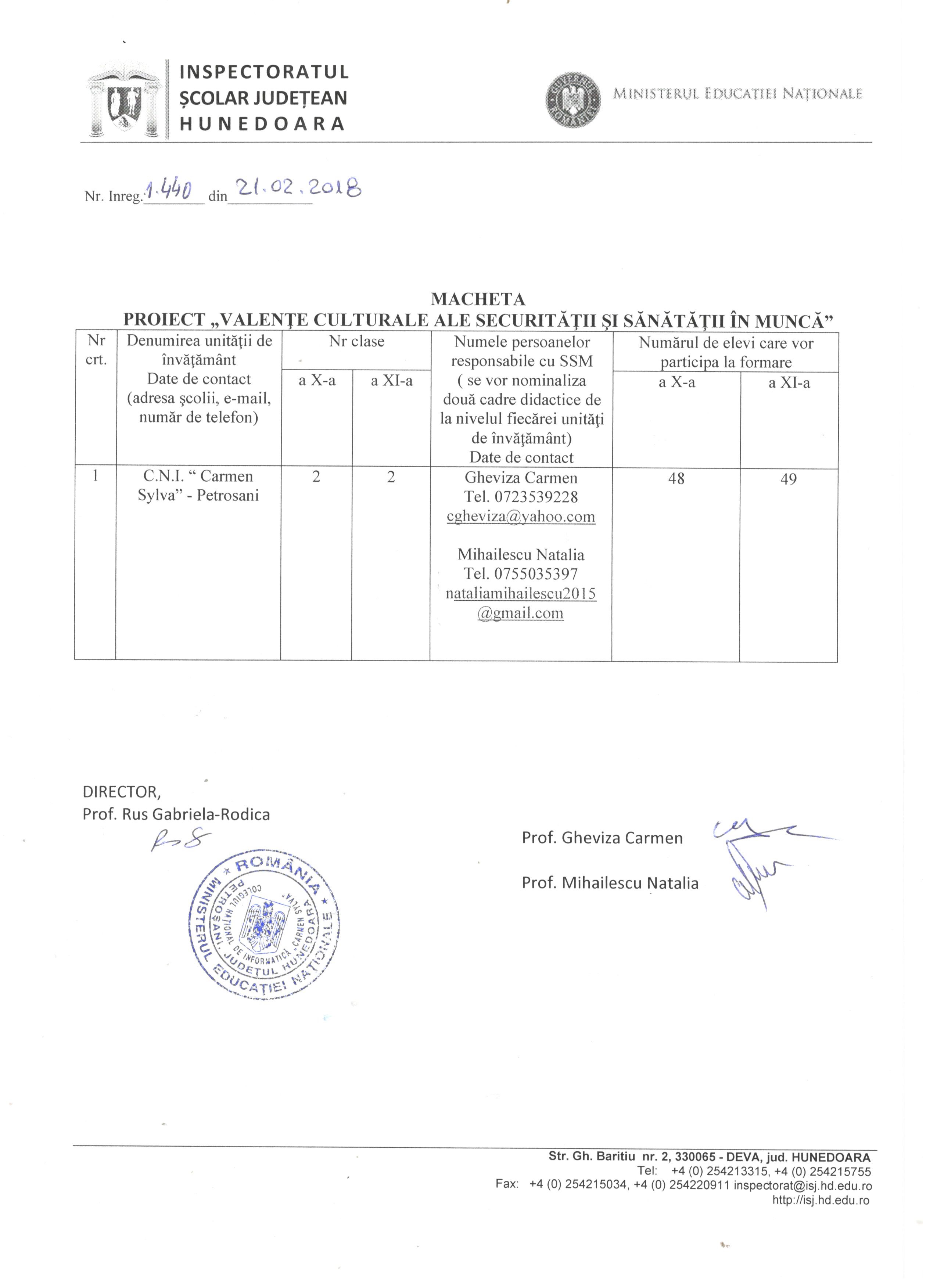 În baza protocolului de parteneriat încheiat între Inspectoratul Şcolar Judeţean Hunedoara şi Inspectoratul Teritorial de Muncă Hunedoara privind colaborarea în cadrul proiectului „Valenţe culturale ale securităţii şi sănătăţii în muncă”, în anul şcolar 2017-2018, se vor derula şi activităţi de formare pentru cadrele didactice responsabile cu S.S.M şi P.S.I. la nivelul unităţii de învăţământ.