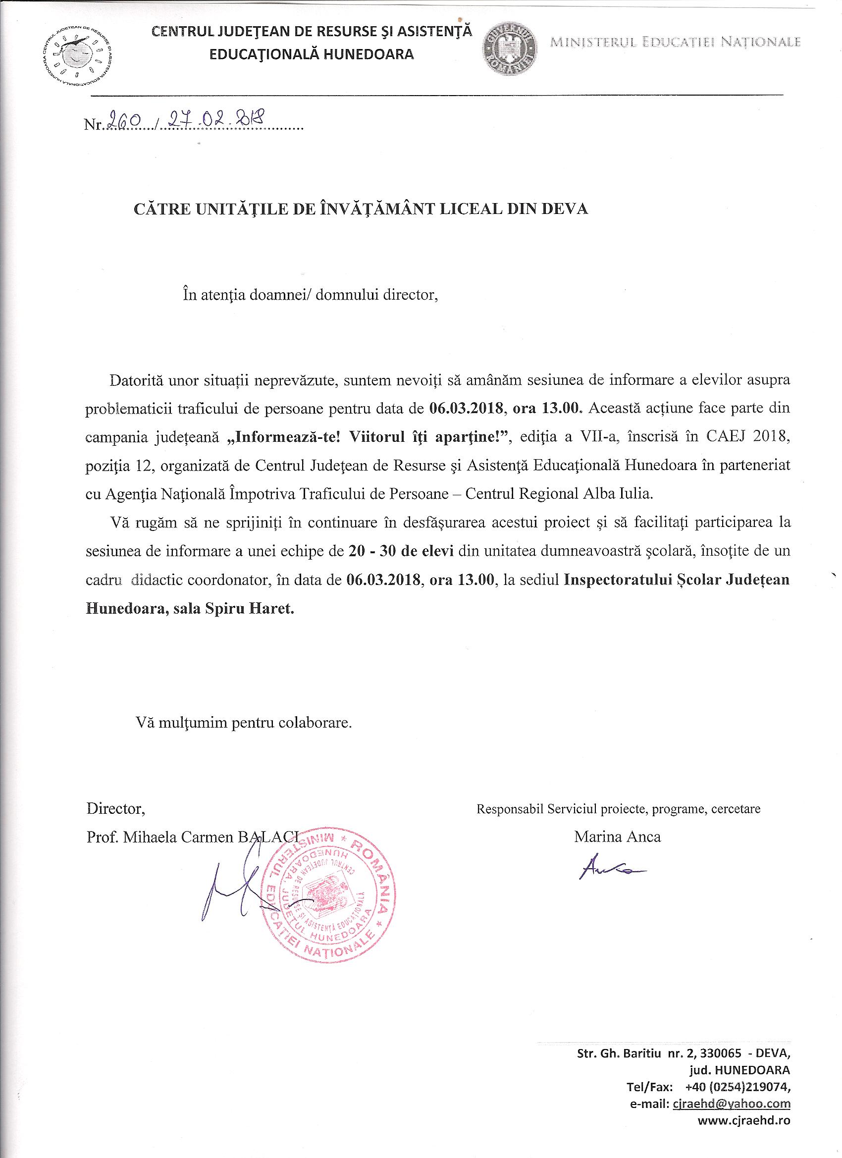 Datorită unor situații neprevăzute, suntem nevoiți să amânăm sesiunea de informare a elevilor asupra problematicii traficului de persoane pentru data de 06.03.2018, ora 13.00. Această acțiune face parte din campania județeană „Informează-te! Viitorul îţi aparţine!”, ediţia a VII-a, înscrisă în CAEJ 2018, poziţia 12, organizată de Centrul Judeţean de Resurse şi Asistenţă Educaţională Hunedoara în parteneriat cu Agenţia Naţională Împotriva Traficului de Persoane – Centrul Regional Alba Iulia.