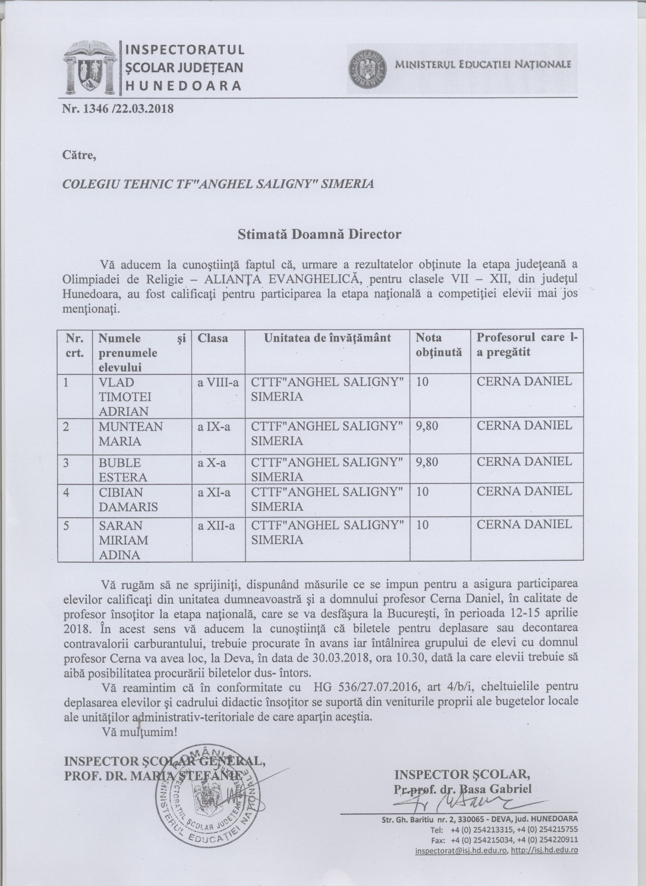În speranța că toți colegii directori vor avea abilitatea de a efectua, la timp, demersurile necesare deplasării elevilor și profesorilor însoțitori, motiv care trebuie să constituie o bucurie pentru comunitatea școlară respectivă și în nici un caz să aducă o nouă povară pe umerii dascălilor care i-au pregătit și cu atât mai mult a minunatelor vlăstare care trebuie acum să se bucure de roadele muncii lor, vă mulțumim anticipat.