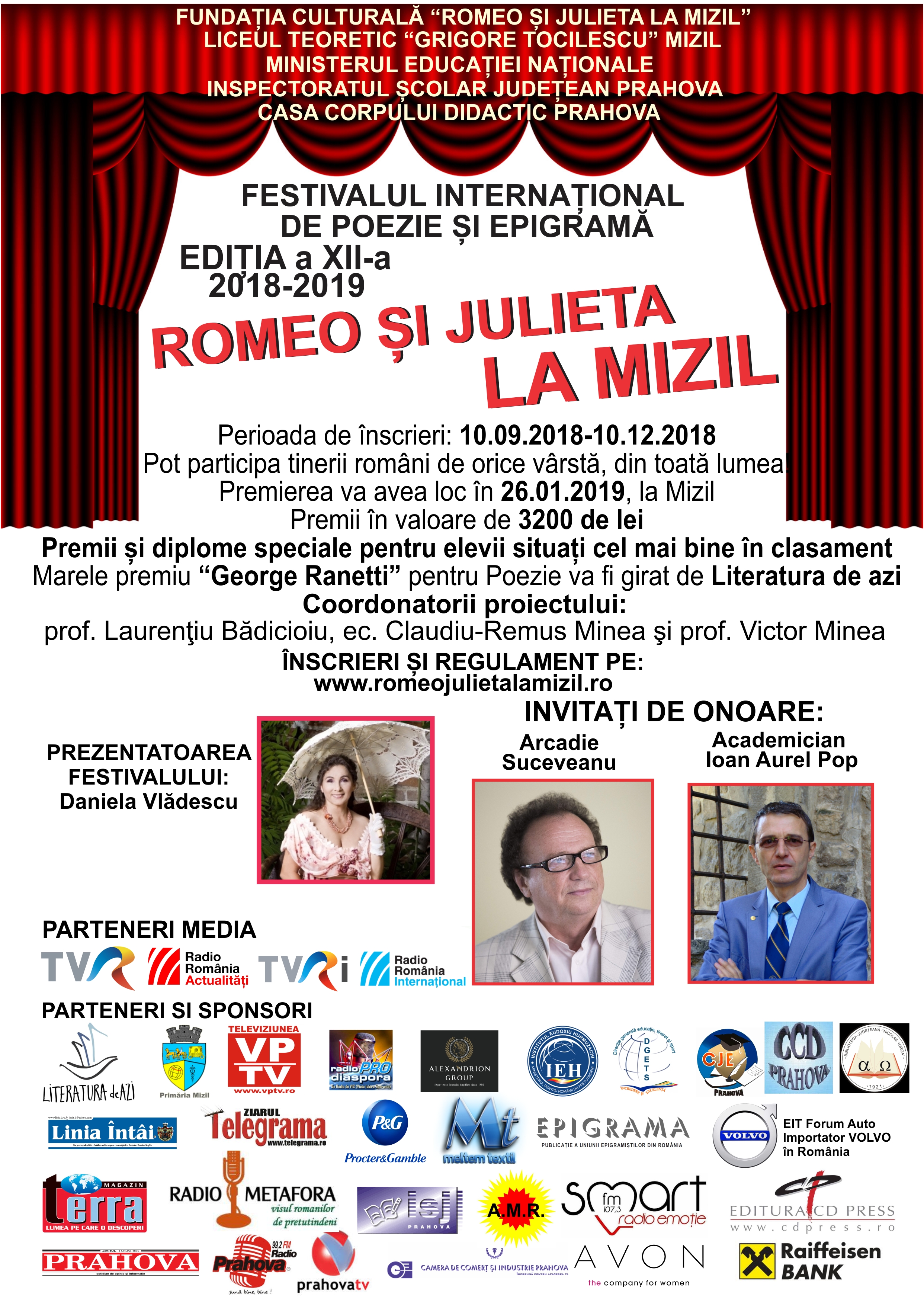 În atașamente găsiți informațiile despre cea de-a XII-a ediție a Festivalului Internațional de Poezie și Epigramă "Romeo și Julieta la Mizil", 2018-2019.