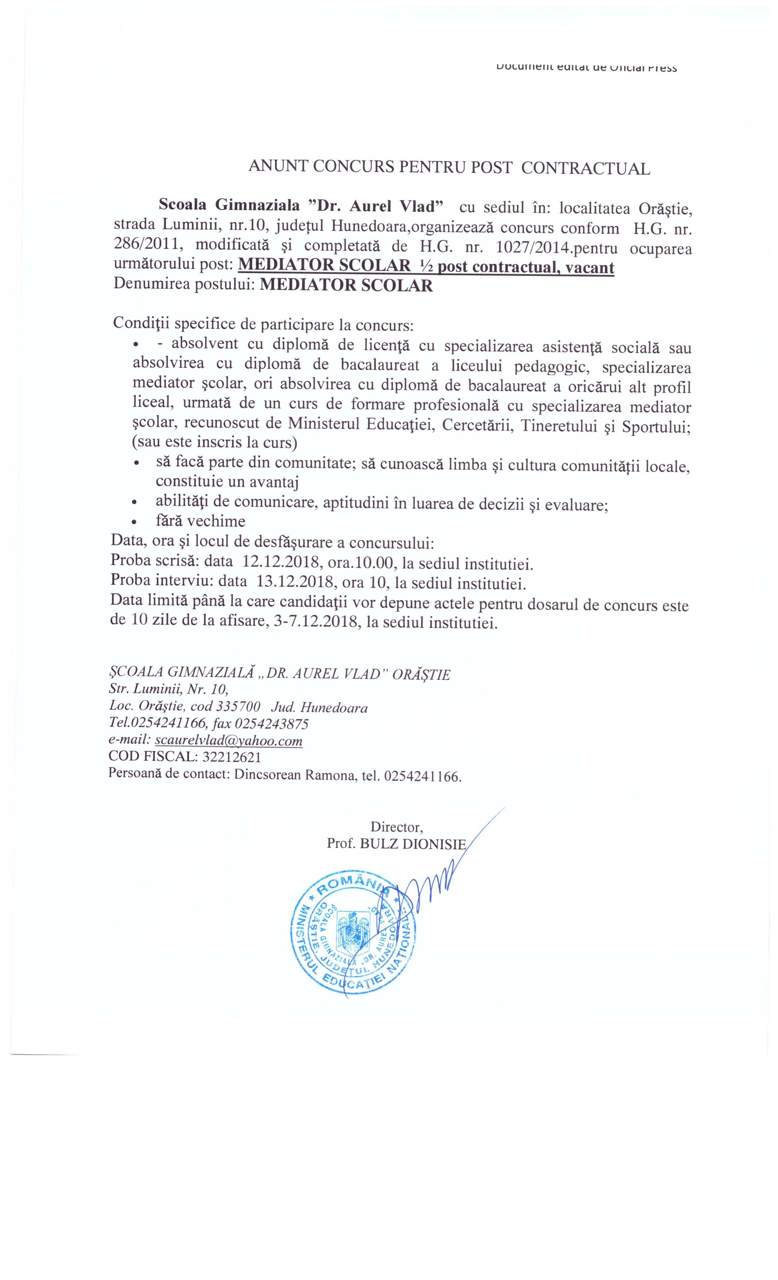 ANUNȚ CONCURS POST MEDIATOR ȘCOLAR
