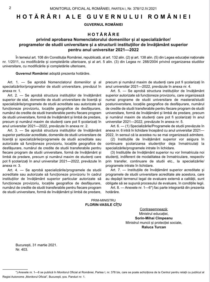 HOTĂRÂRE nr. 403/2021 privind aprobarea Nomenclatorului domeniilor și al specializărilor/ programelor de studii universitare și a structurii instituțiilor de învățământ superior pentru anul universitar 2021—2022