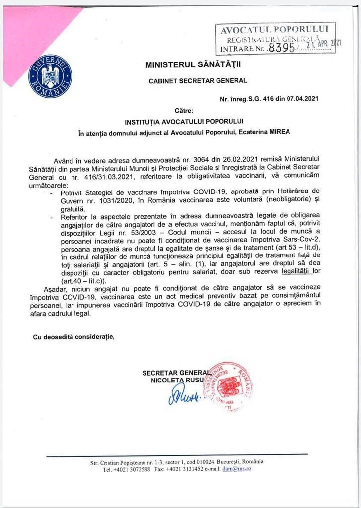 „Potrivit strategiei de vaccinare împotriva Covid-19, aprobată prin Hotărârea de Guvern numărul 103/2020, în România vaccinarea este voluntară (neobligatorie) și gratuită. Referitor la aspectele prezentate în adresa dumneavoastră legate de obligarea angajaților de către angajatori de a efectua vaccinul, menționăm faptul că, potrivit dispozițiilor Legii nr. 53/2003 - Codul Muncii - accesul la locul de muncă a persoanei încadrate nu poate fi condiționat de vaccinarea împotriva Sars-Cov-2, persoana angajată are dreptul la egalitate de șanse și de tratament (art. 33 - lit. d), în cadrul relațiilor de muncă funcționează principiul egalității de tratament față de toți salariații și angajatorii (art. 5 - alin. (1) ), iar angajatorul are dreptul să dea dispoziții cu caracter obligatoriu pentru salariat doar sub rezerva legalității lor (art.40 - lit. c)). Așadar, nici un angajat nu poate fi condiționat de către angajator să se vaccineze împotriva Covid-19, vaccinarea este un act medical preventiv bazat pe consimțământul persoanei, iar impunerea vaccinării împotriva Covid-19 de către angajator o apreciem în afara cadrului legal”, se arată în adresa transmisă Avocatului Poporului de Ministerul Sănătății.