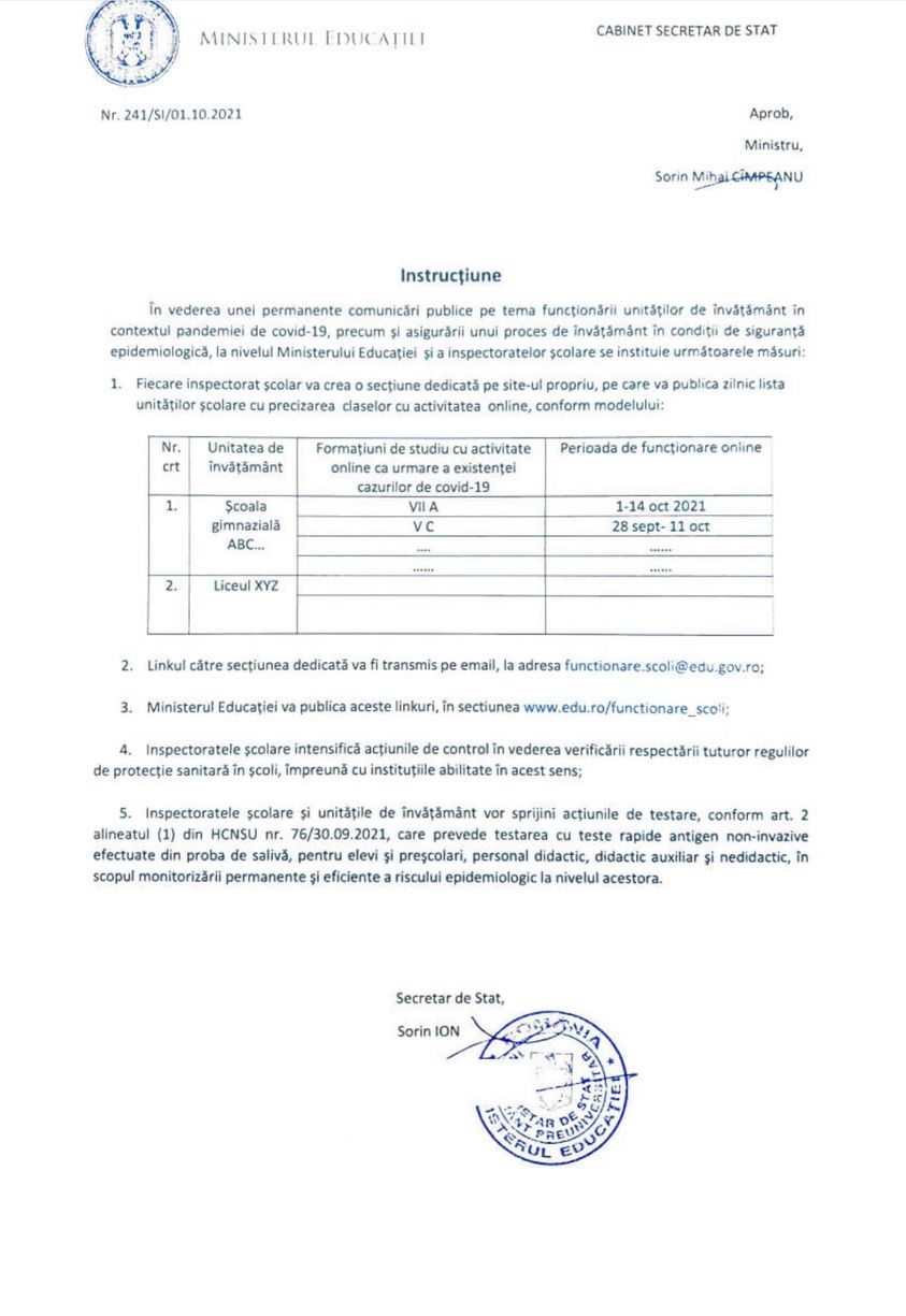 Ministerul Educației a transmis în 1 octombrie, în teritoriu, o circulară prin care solicită inspectoratelor școlare județene să publice, zilnic, situația actualizată a claselor care trec în on-line din cauza cazurilor Covid confirmate.