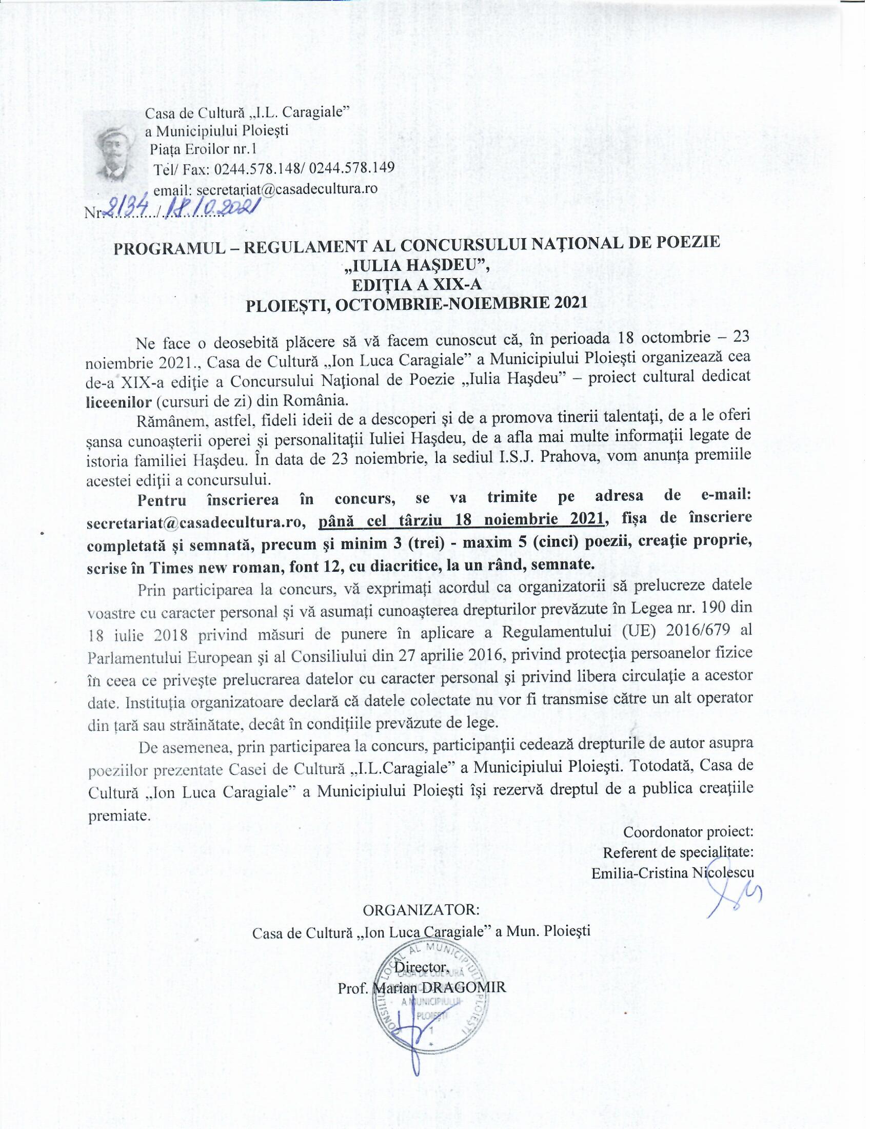 Ne face o deosebită plăcere să vă facem cunoscut că, în perioada 18 octombrie – 23 noiembrie 2021, Casa de Cultură „Ion Luca Caragiale” a Municipiului Ploiești organizează cea de-a XIX-a ediţie a Concursului Naţional de Poezie „Iulia Haşdeu” – proiect cultural dedicat liceenilor (cursuri de zi) din România.