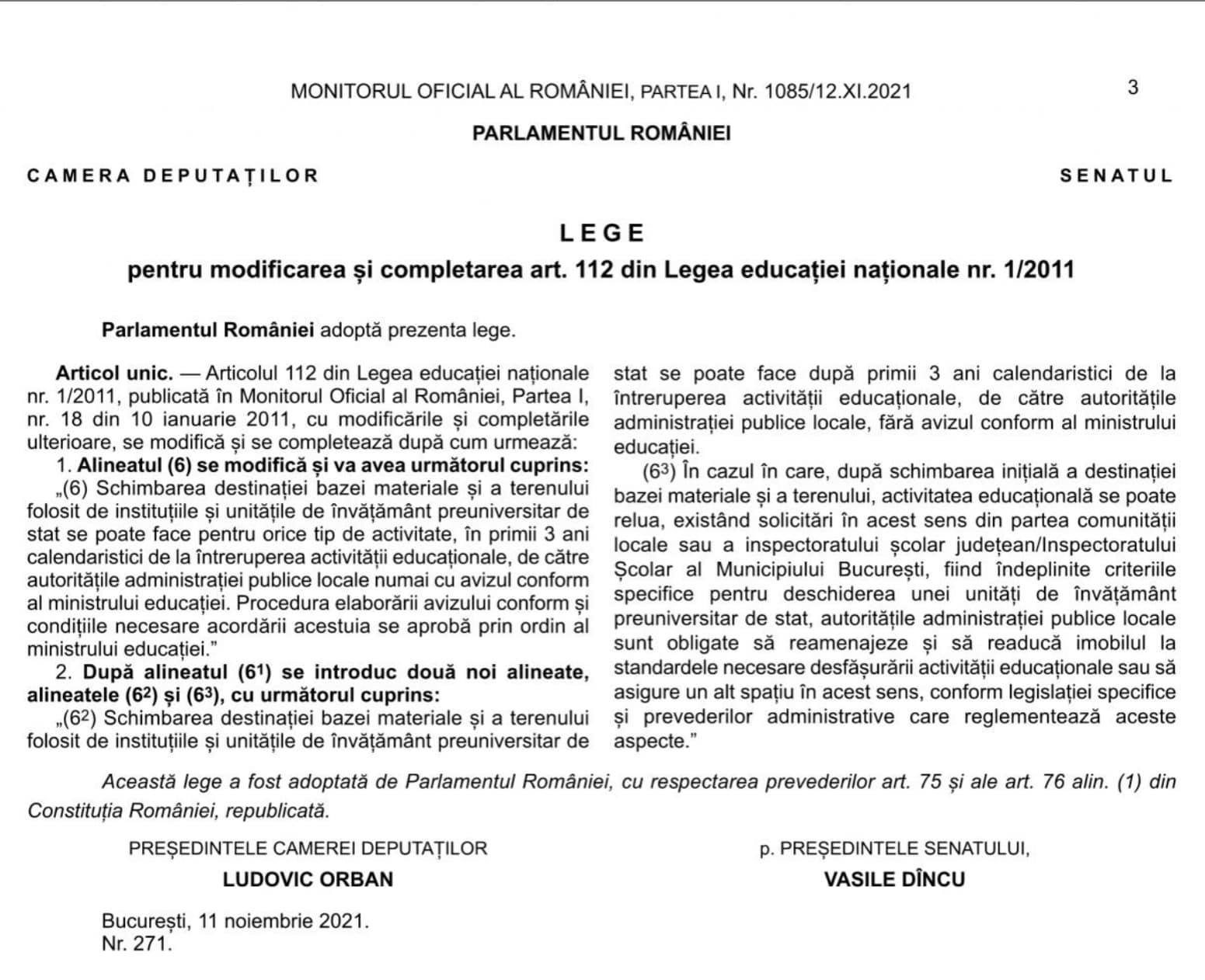 Legea nr. 271/2021 pentru completarea art. 112 din Legea educatiei naționale nr. 1/2011
