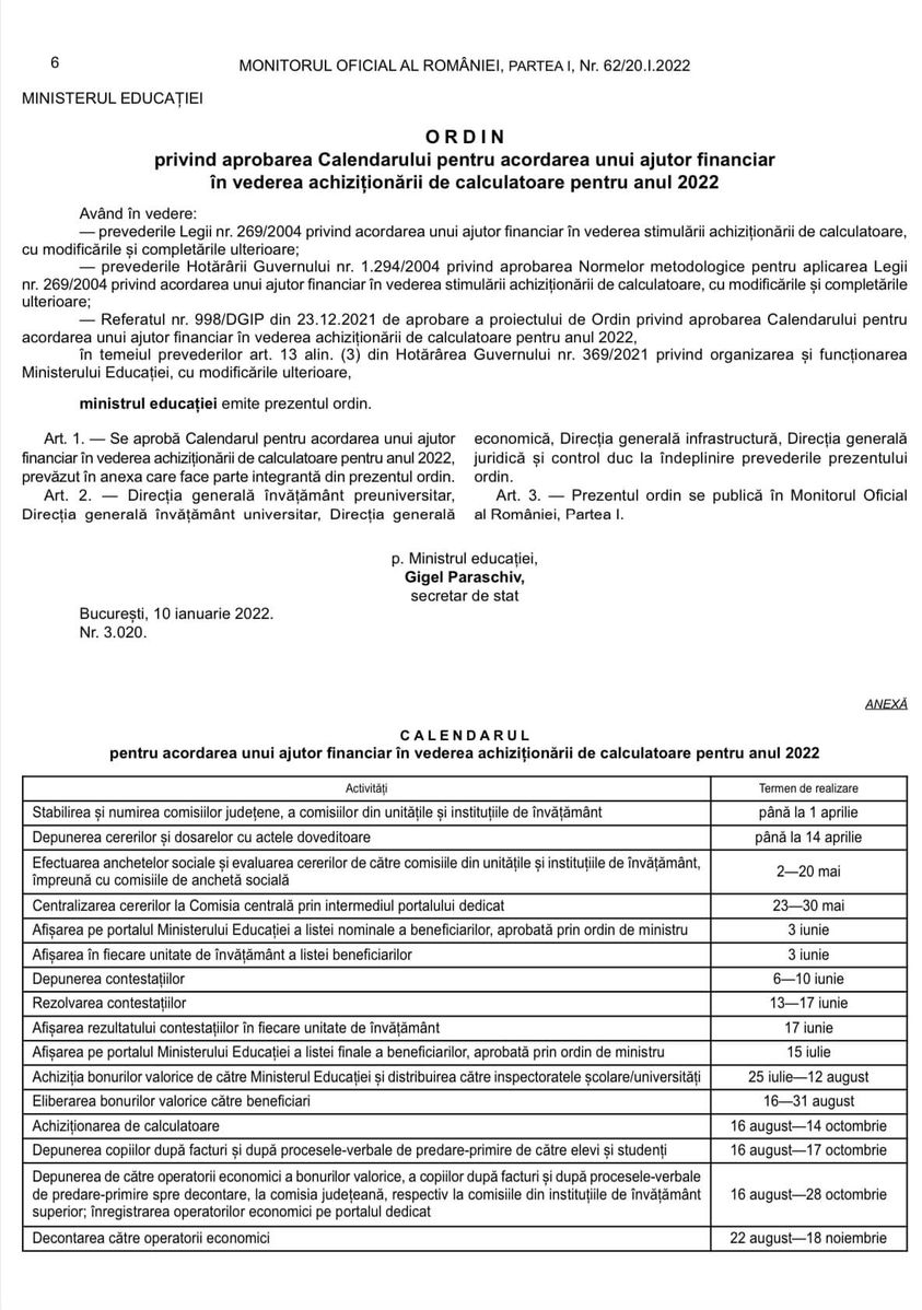Ordin al ministrului educației privind aprobarea Calendarului pentru acordarea unui ajutor financiar în vederea achiziționării de calculatoare pentru anul 2022