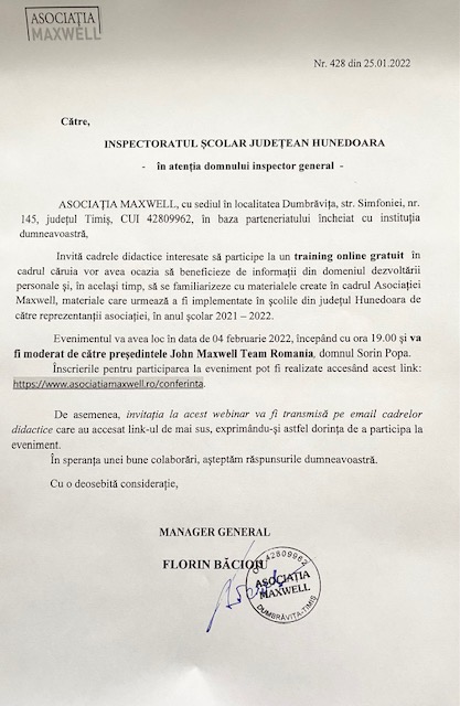 Asociatia Maxwell, va invita la un training online teme de dezvoltare personala ,in data de 4.02.2022, la ora 19.00. O parte dintre colegi, lucreaza cu aceasta asociatie si pe acest aspect, am primit un feedback pozitiv.