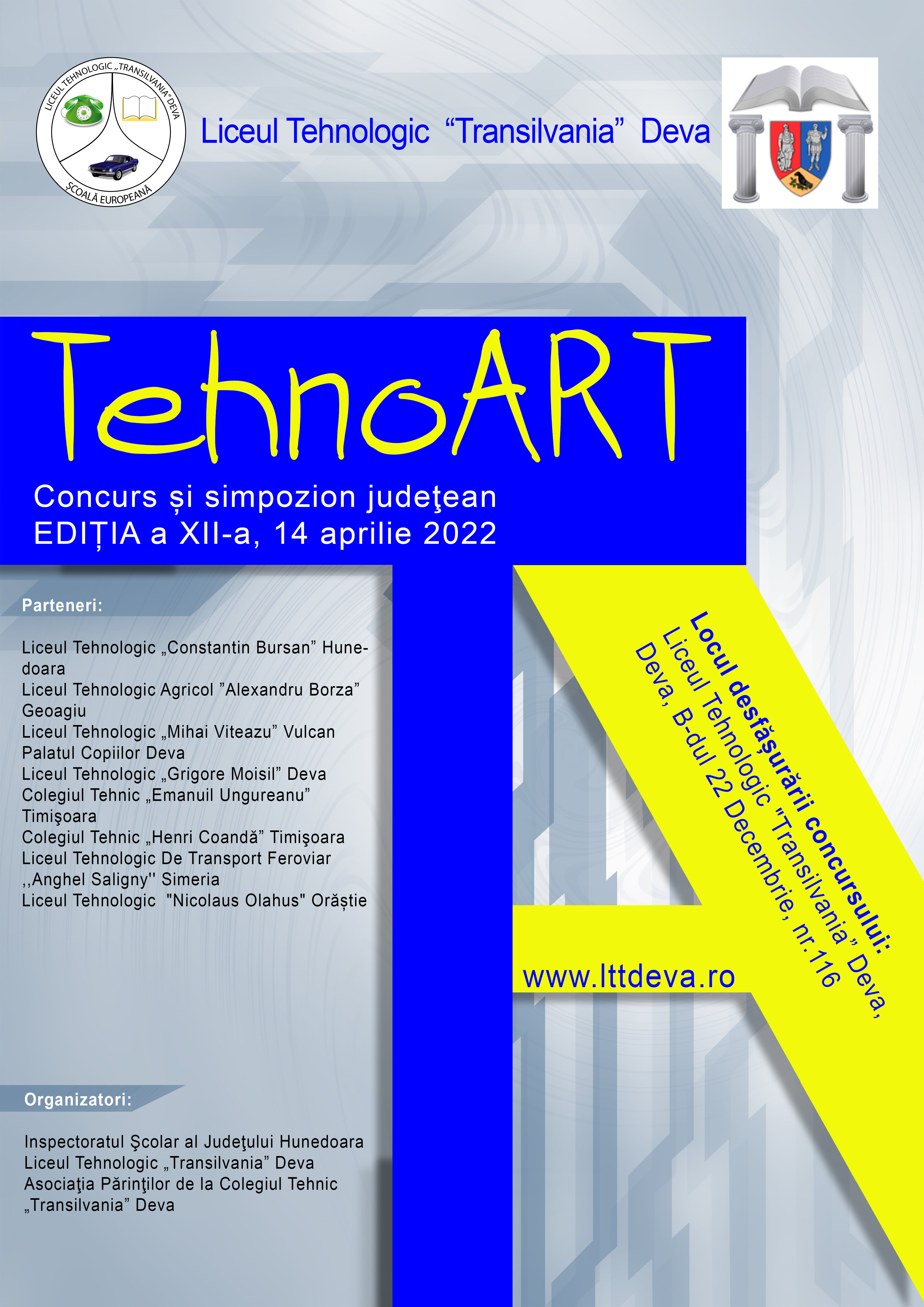 Liceul Tehnologic “Transilvania” Deva vă invită să participaţi la concursul și simpozionul județean „Tehno-ART”- ediţia a XII-a, care se desfășura online în data de 14 aprilie 2022.