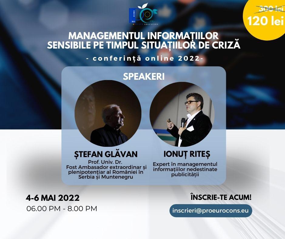 În perioada 4-6 mai 2022, intervalul orar 18-20, va avea loc conferința online cu tema „Managementul informațiilor sensibile pe timpul situațiilor de criză”.