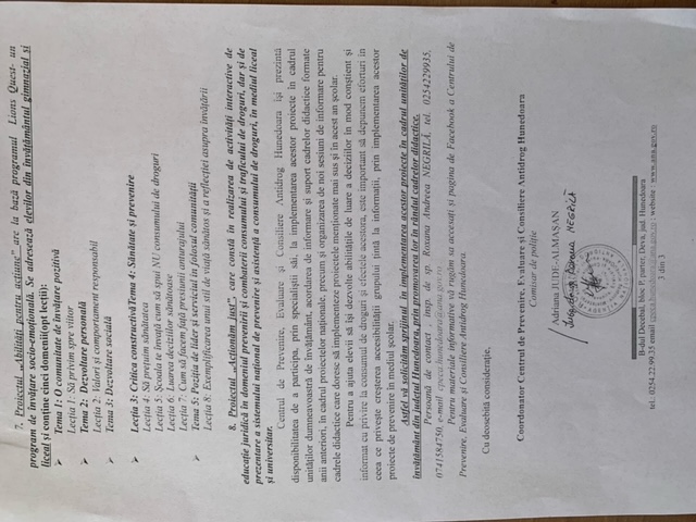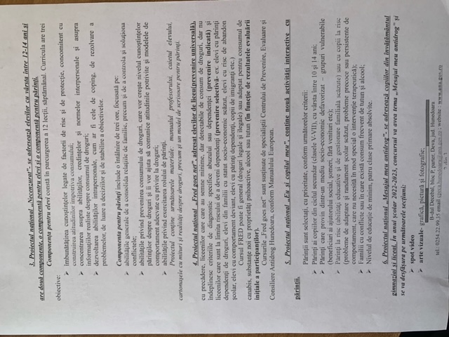 În urma adresei “Centrului de Prevenire Evaluare și Consiliere Antidrog” cu Nr. 3842/07.09.2022, vă transmit detaliile cu privire la proiectele implementate de AGENȚIA NAȚIONALĂ ANTIDROG - Centrul de Prevenire, Evaluare și Consiliere Antidrog Hunedoara, pe parcursul anului școlar 2022-2023, în parteneriat cu MINISTERUL EDUCAȚIEI, conform Protocolului de colaborare, încheiat de cele două entități.