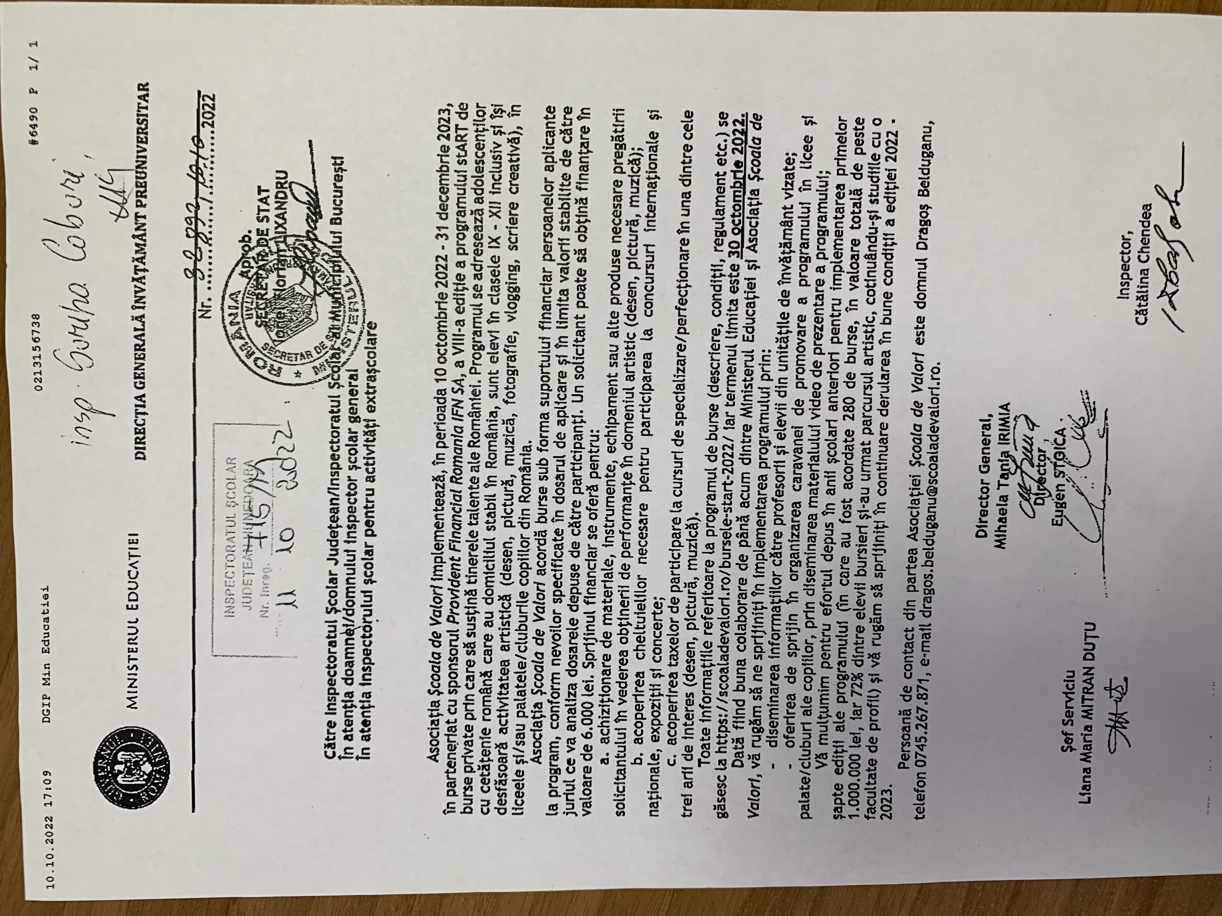 În urma adresei ISJ nr. 715/11.10.2022, vă anunțăm că "Școala de Valori", implementează în perioada 10 octombrie 2022- 31 decembrie 2023, în parteneriat cu sponsorul Provident Financial IFN SA, a VIII-a ediție a programului START de burse private, prin care dorește să susțină tinerele talente din România. Programul se adresează liceenilor iar în atașament aveți informațiile utile.