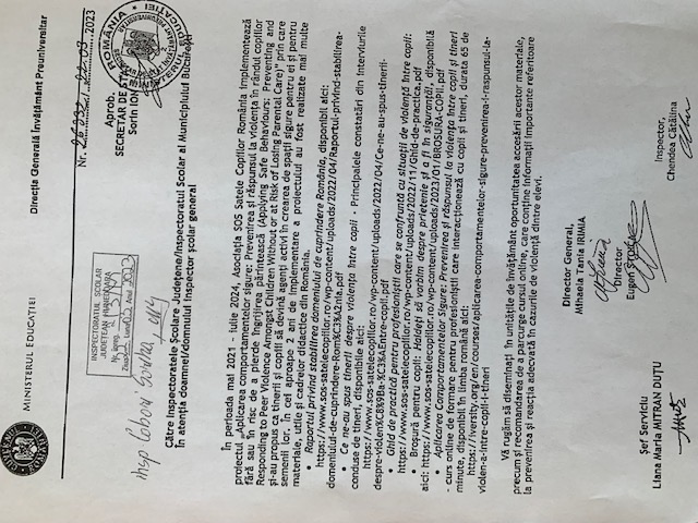 În urma adresei ME, cu nr. 213/M/22.03.2023, vă informăm că în perioada mai 2021- iunie 2024, Asociația SOS Satele Copiilor România, implementează proiectul „Aplicarea comportamentelor sigure Prevenirea și răspunsul la violență în rândul copiilor fără sau în risc de a pierde îngrijirea părintească”, prin care și-au propus ca tinerii și copiii să devină agenți activi în crearea de spații sigure pentru ei și pentru semenii lor. Vă atașez adresa de unde puteți accesa linkuri cu ghid de practică, raport, constatări și interviuri conduse de tineri, broșuri etc.