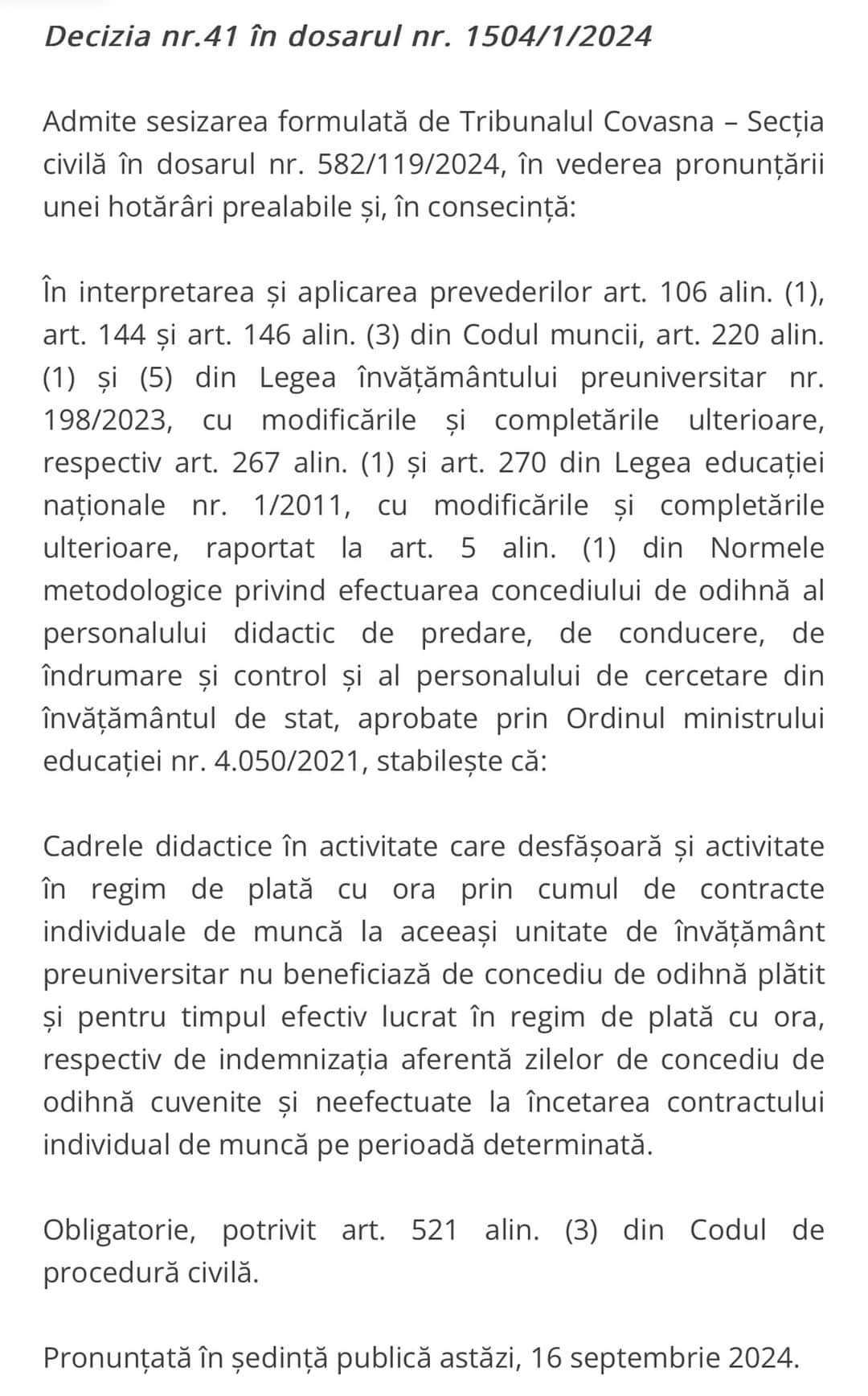 Cadrele didactice în activitate care desfăsoară si activitate in regim de plata cu ora prin cumul de contracte individuale de muncã la aceeasi unitate de învățământ preuniversitar nu beneficiaza de concediu de odihna platit si pentru timpul efectiv lucrat în regim de platã cu ora, respectiv de indemnizatia aferenta zilelor de concediu de odihna cuvenite si neefectuate la încetarea contractului individual de munca pe perioada determinata.