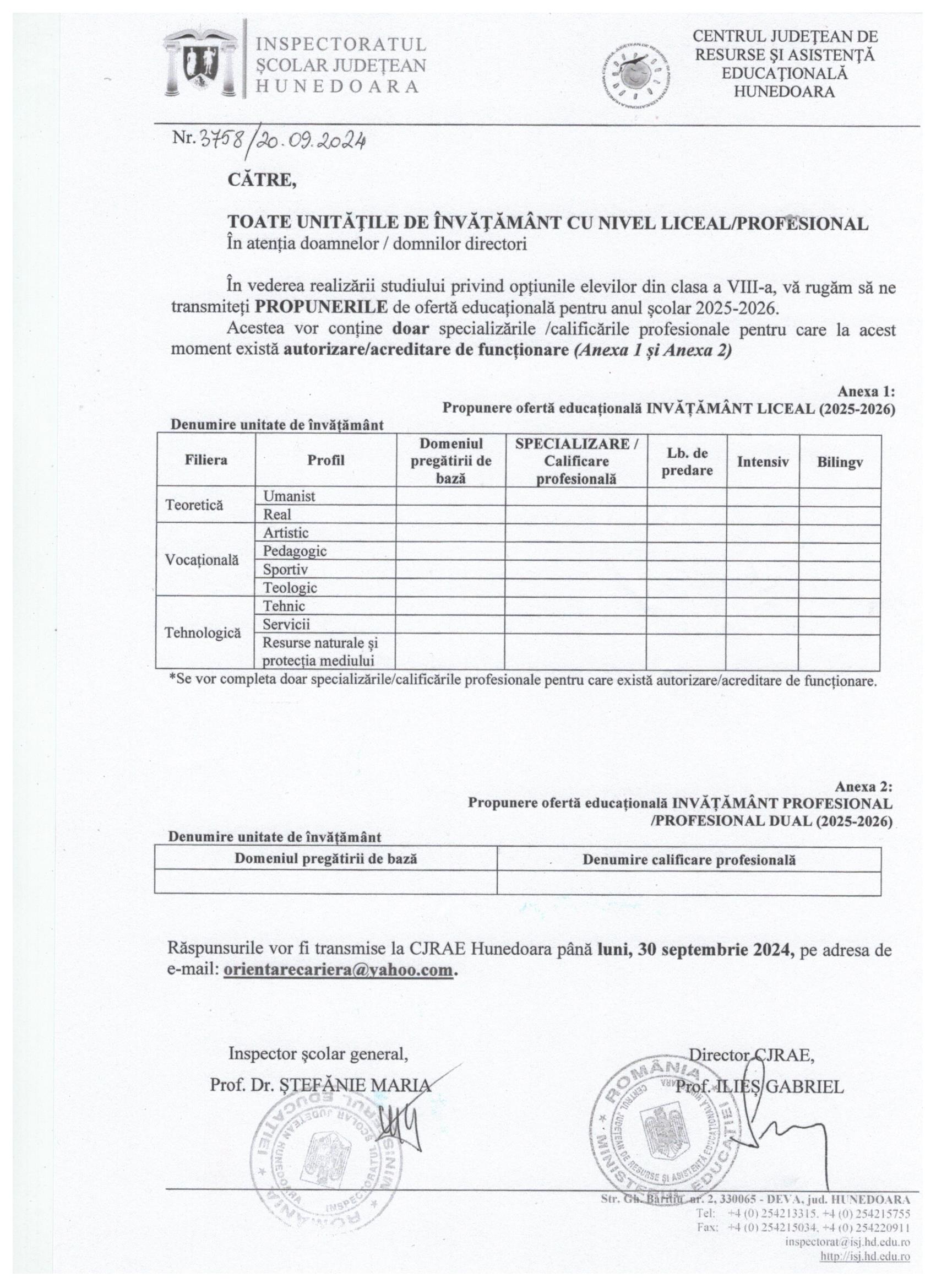 În vederea realizării studiului privind opțiunile elevilor din clasa a VIII-a, vă rugăm să ne transmiteți propunerile de ofertă educațională pentru anul școlar 2025-2026.