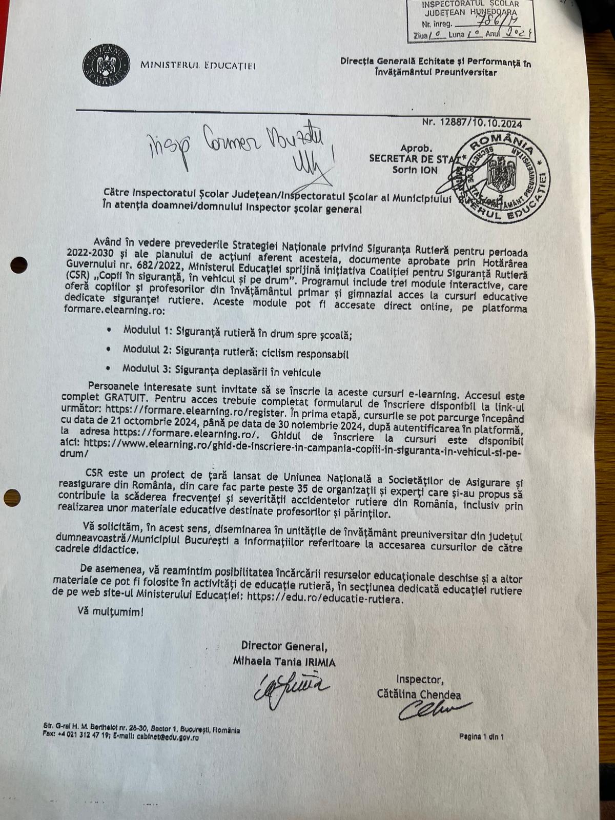 Atașăm adresa referitoare la demersurile realizate de CSR (Coaliția pentru Siguranță Rutieră) în cadrul programului „Copii în siguranță, în vehicul și pe drum”, care include 3 module interactive și educative pentru elevi și profesori, care pot fi accesate direct online, pe platforma formare.elearning.ro.