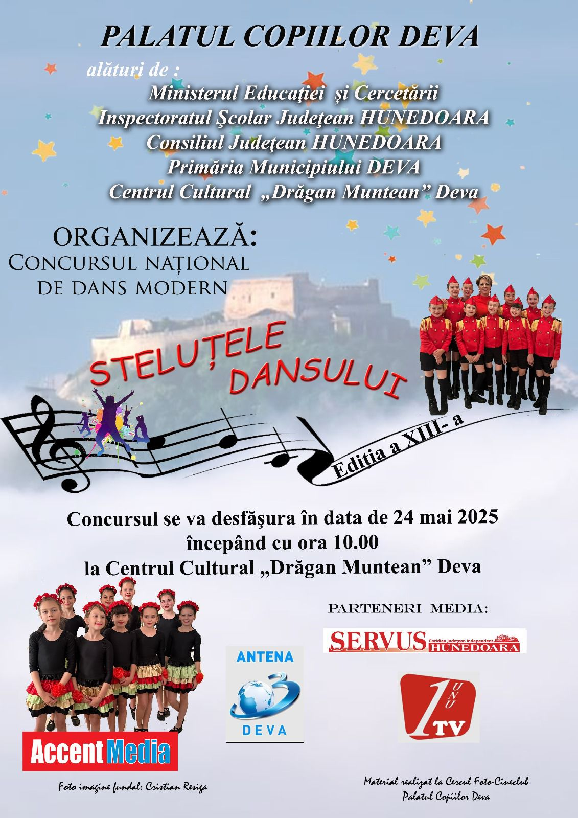 În data de 24 mai 2025, începând cu ora 10, va avea loc etapa națională a Concursului de Dans modern "STELUTELE DANSULUI" ediția a XIII-a, la Centrul Cultural "Drăgan Muntean" din Deva.