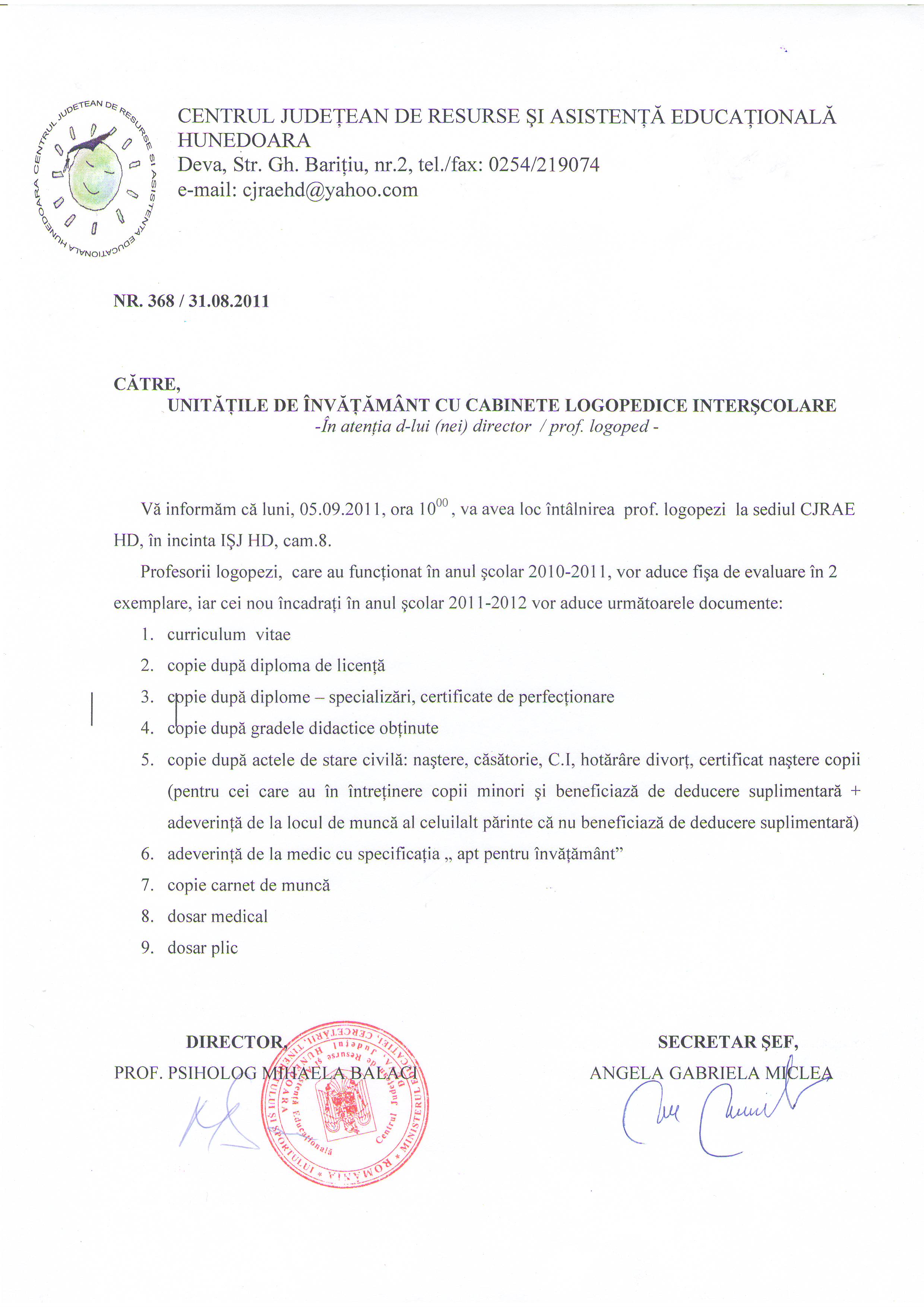 În fişierele ataşate găsiiţi detalii cu privire la şedinţa din 05.09.2011, ora 10 a profesorilor logopezi, profesorilor din cabinetele de asistenţă psihopedagogică.