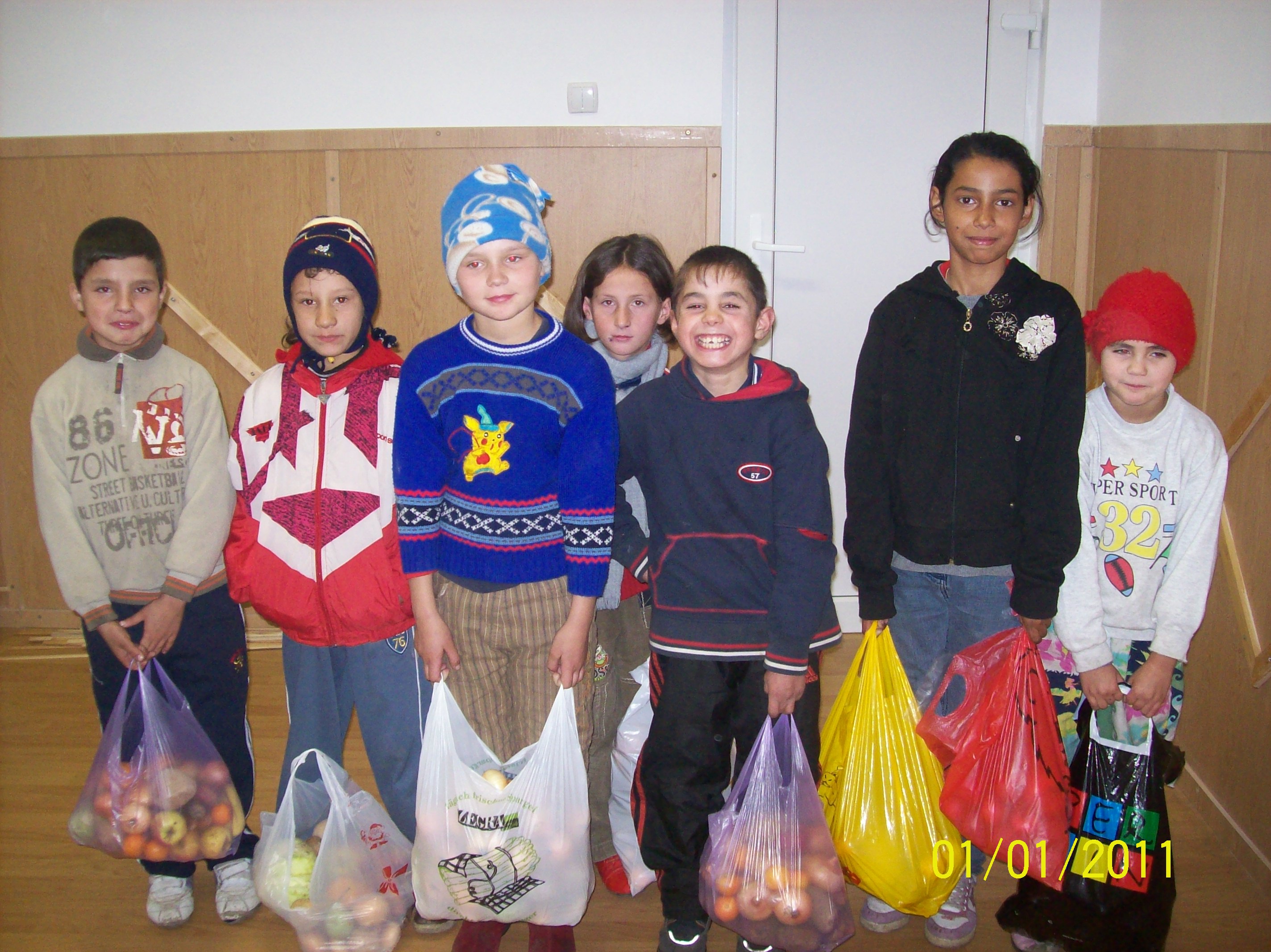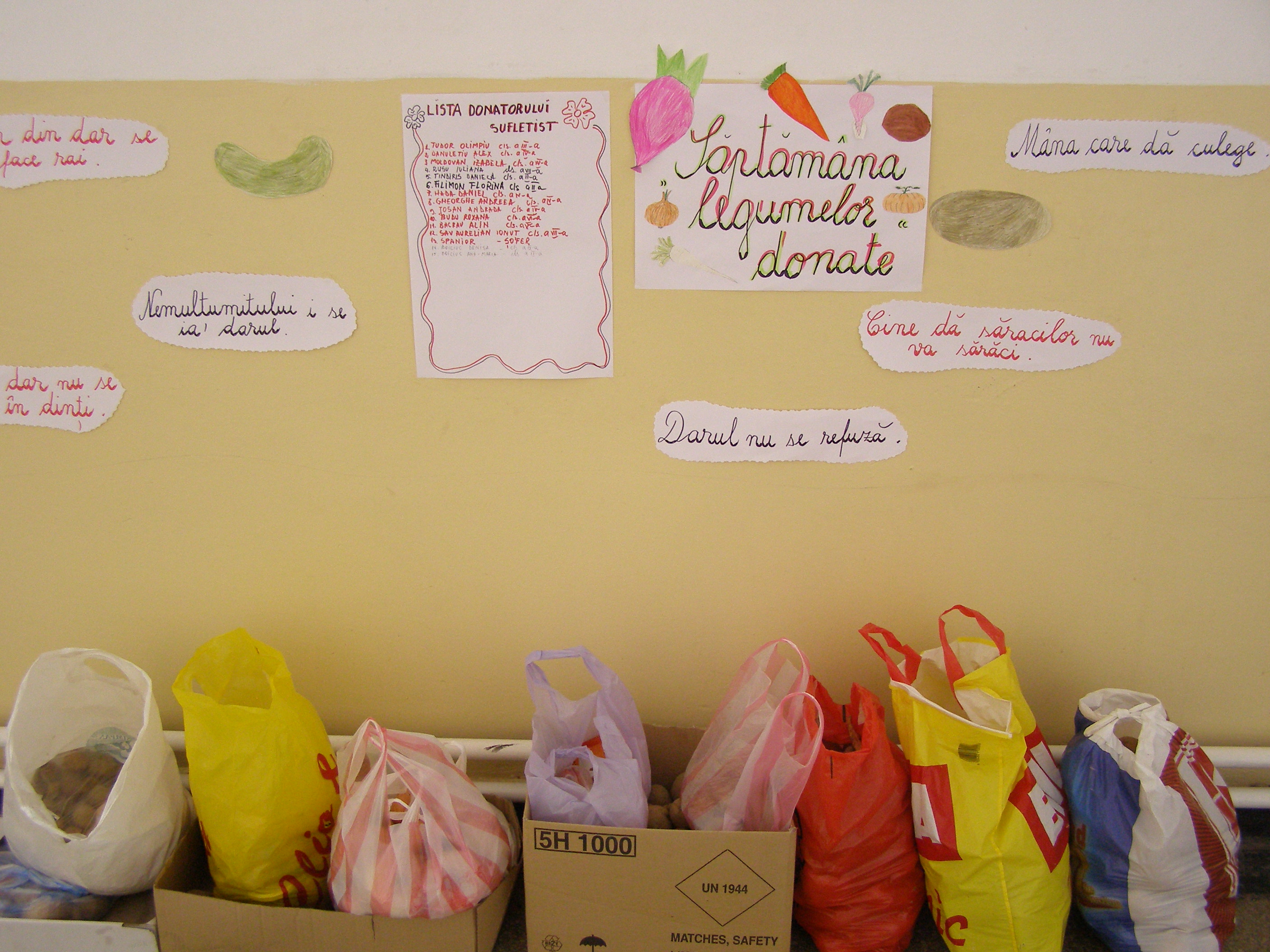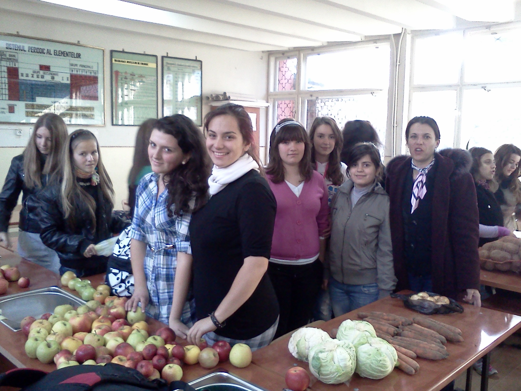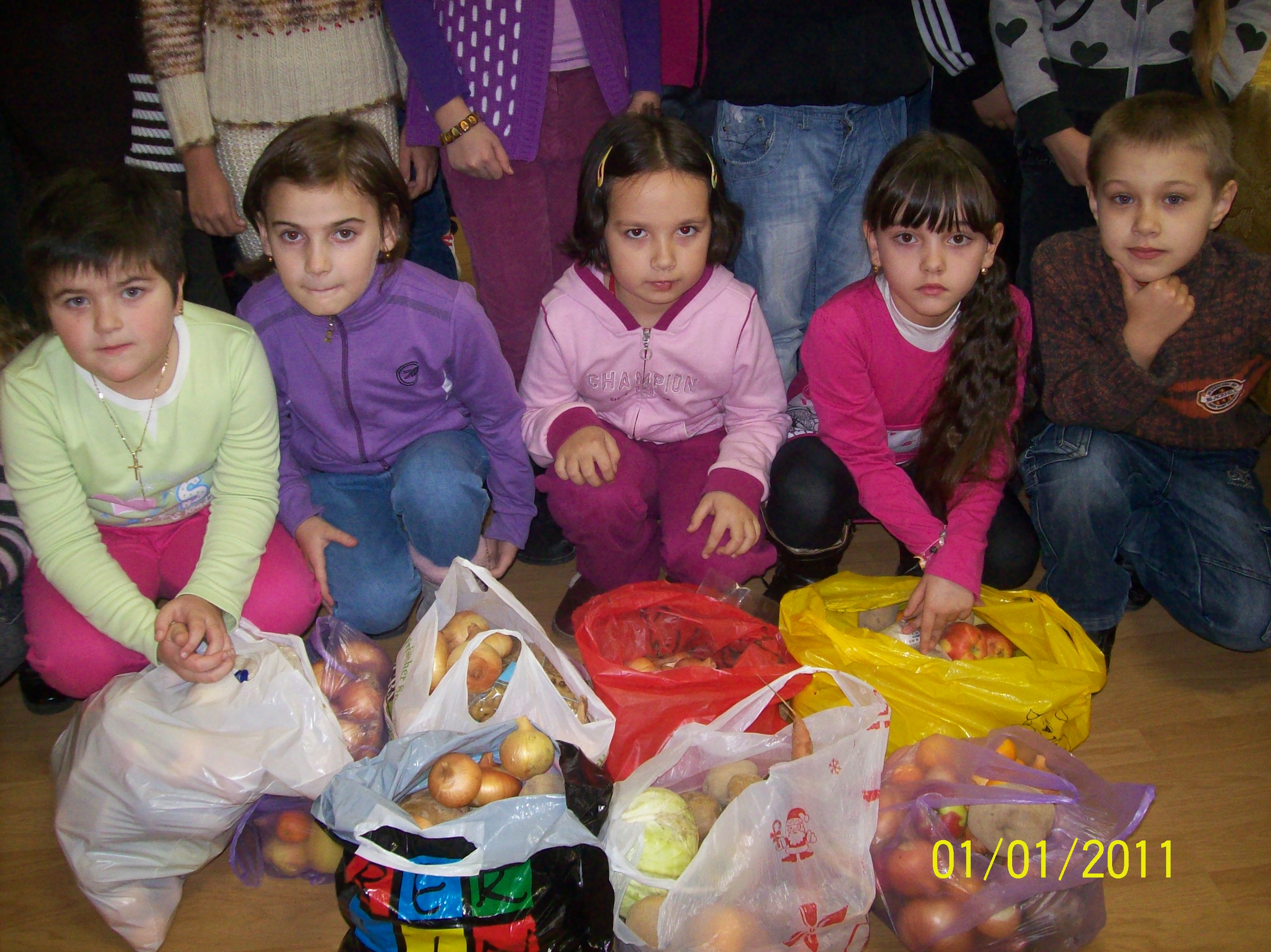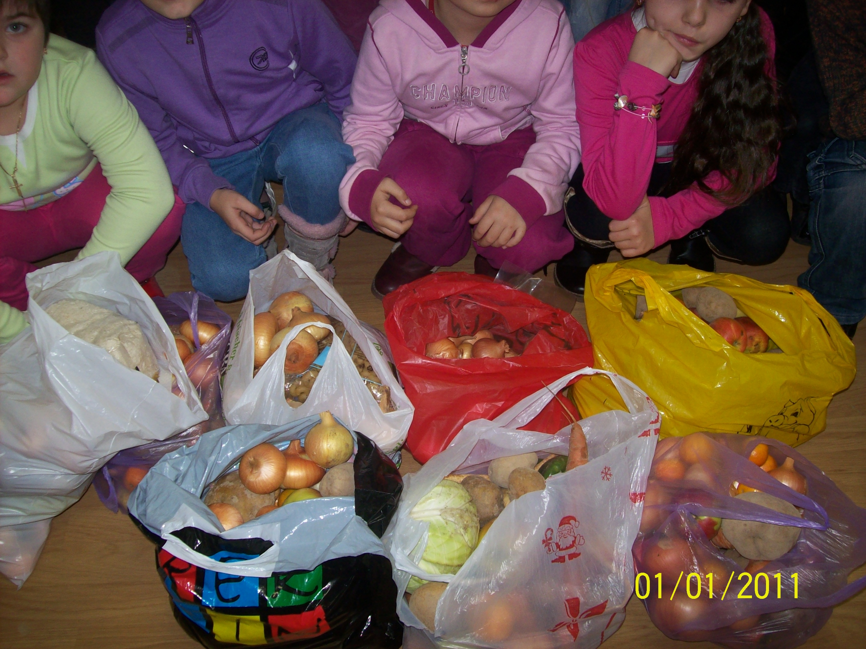 Au fost colectate si distribuite legume si fructe in urmatoarele cantitati:35 kg de cartofi, 20 kg de ceapa, 3 kg de usturoi, 6 kg de fasole, 10 kg de morcovi si patrunjel, 2dovleci comestibili)
