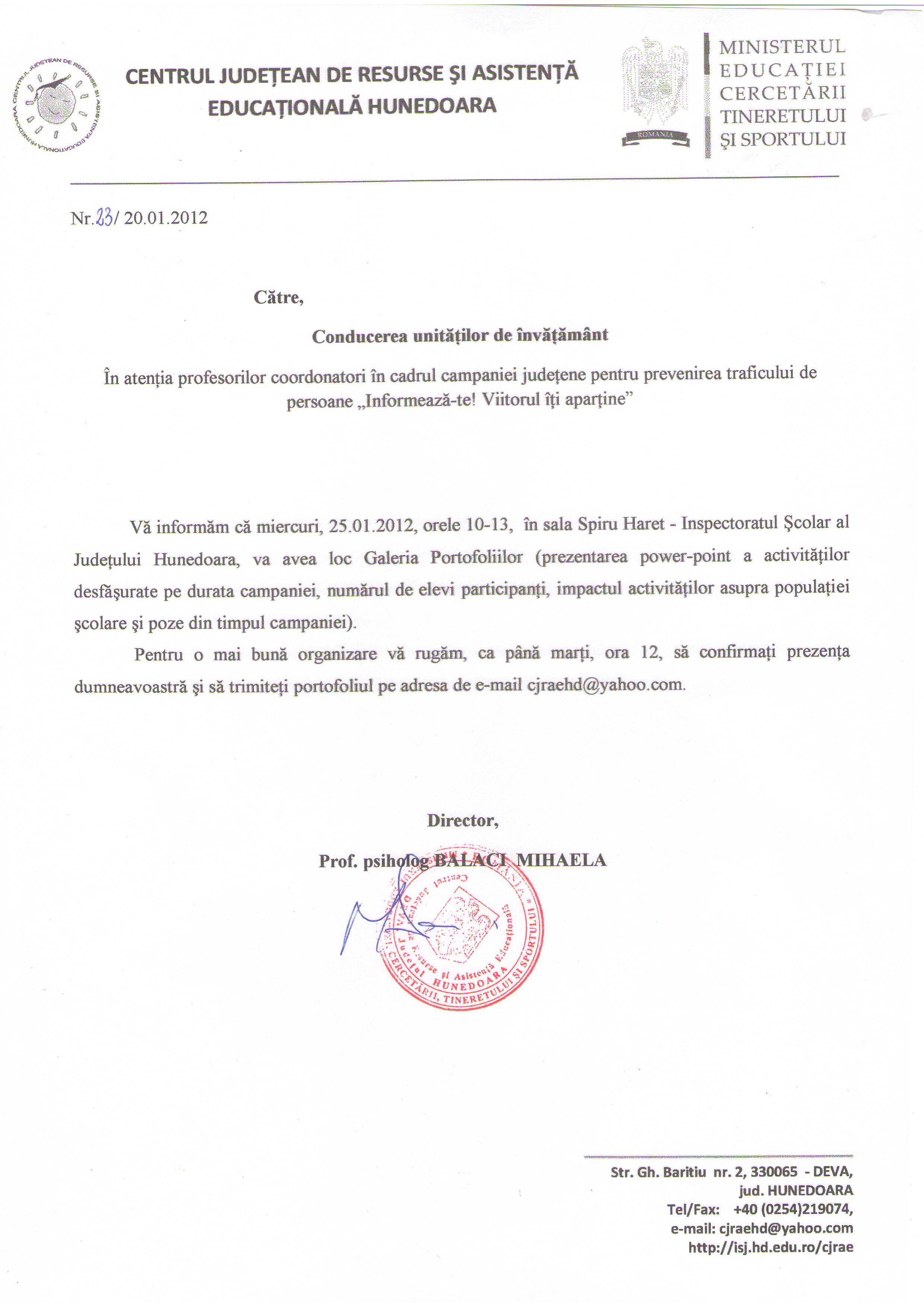 atașez acestui subiect adresa prin care profesorii coordonatori în cadrul Campaniei județene pentru prevenirea traficului de persoane ”Informează-te!Viitorul îți aparține” sunt invitați miercuri, 25.01.2012, ora 10 , la IȘJ Hunedoara, sala ”Spiru Haret”.