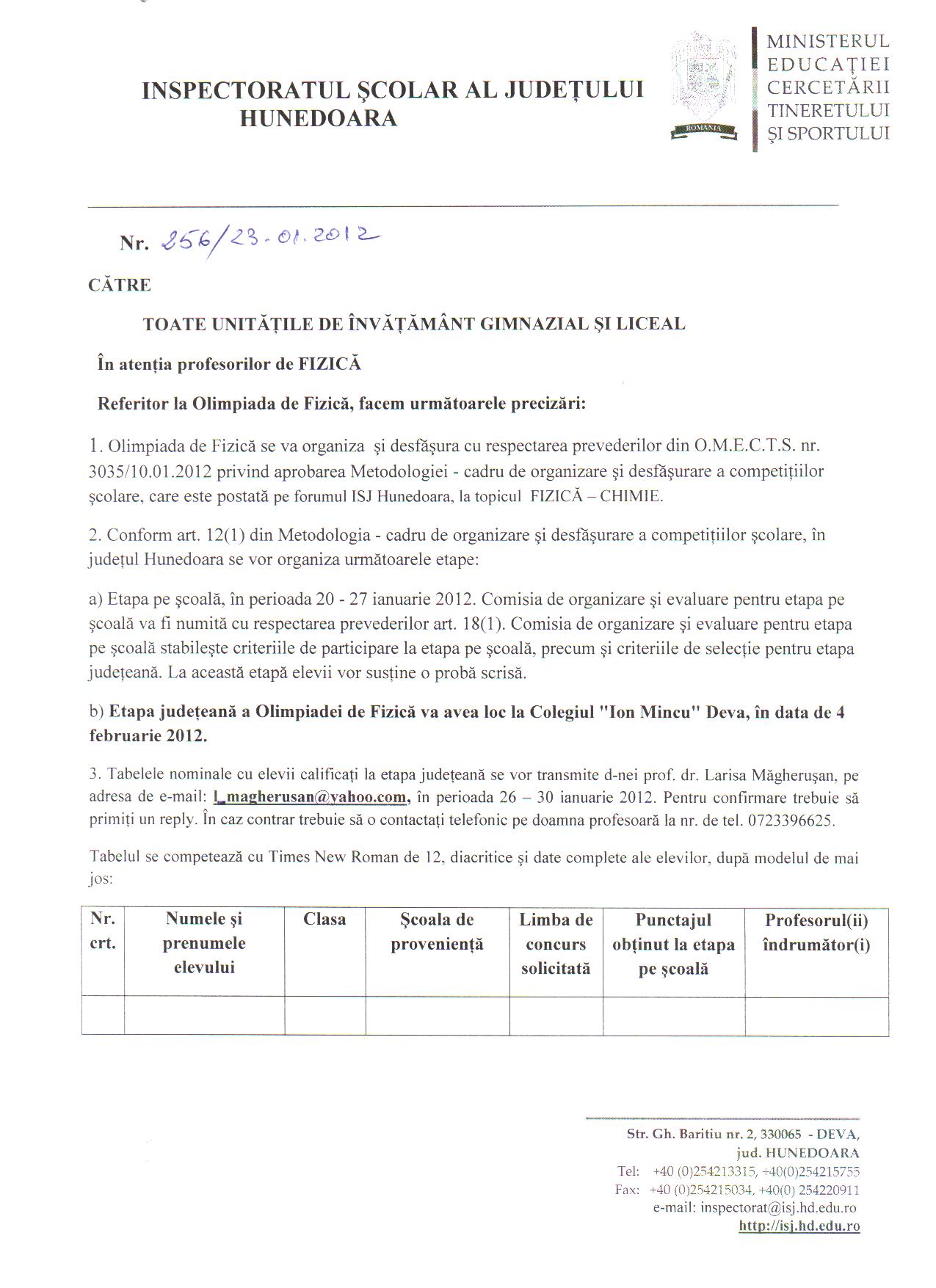 In fişierele ataşate este postată adresa ISJ Hunedoara nr. 256/23.01.2012, referitoare la Olimpiada de Fizică. Această adresă a fost transmisă prin zone către toate unităţile şcolare de nivel gimnazial şi liceal din judeţ.