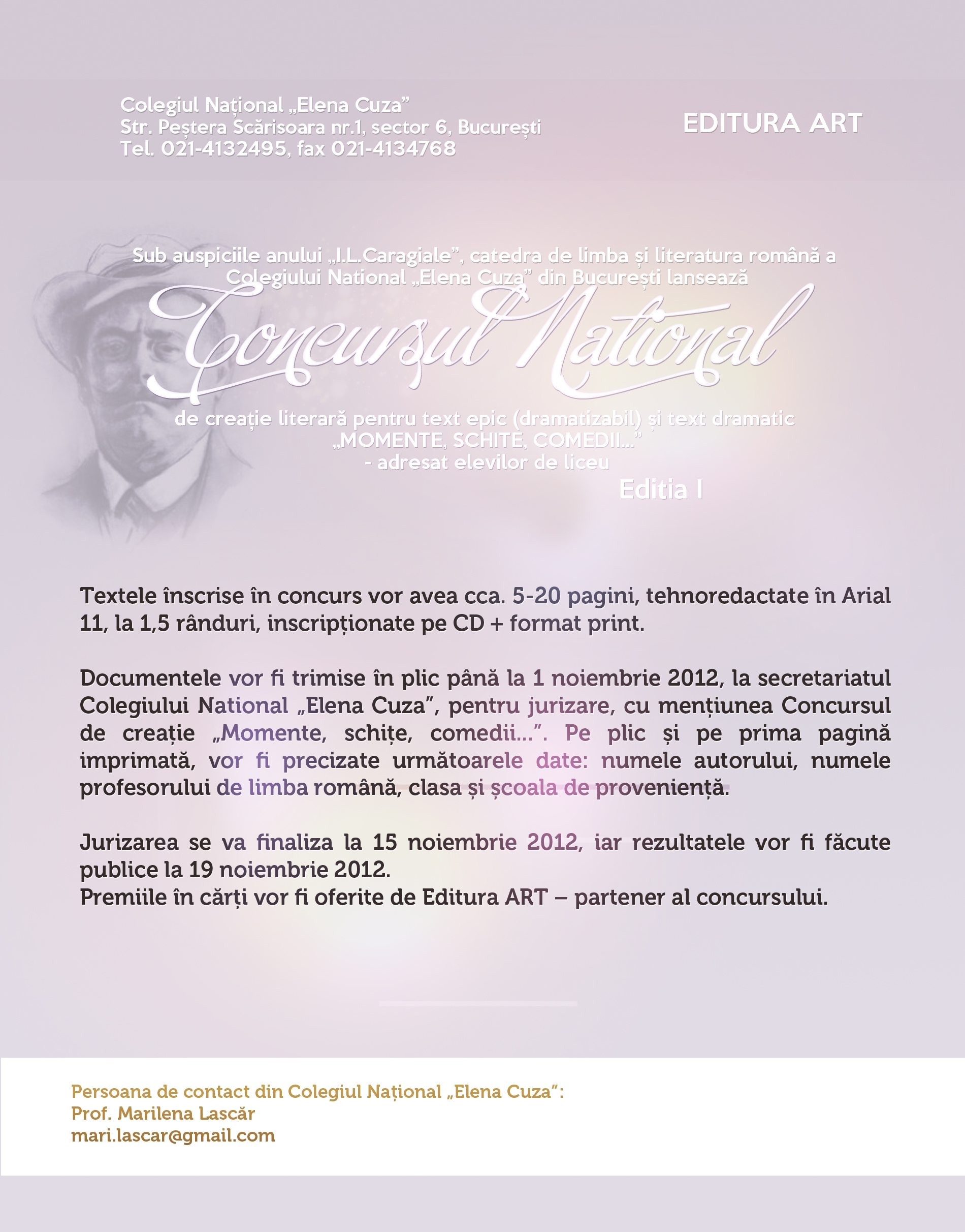 Colegiului Naţional „Elena Cuza” din București lansează Concursul național de creație literară „Momente, schițe, comedii...”, adresat elevilor de liceu. Participarea constă în crearea unor texte epice (dramatizabile) sau texte dramatice.